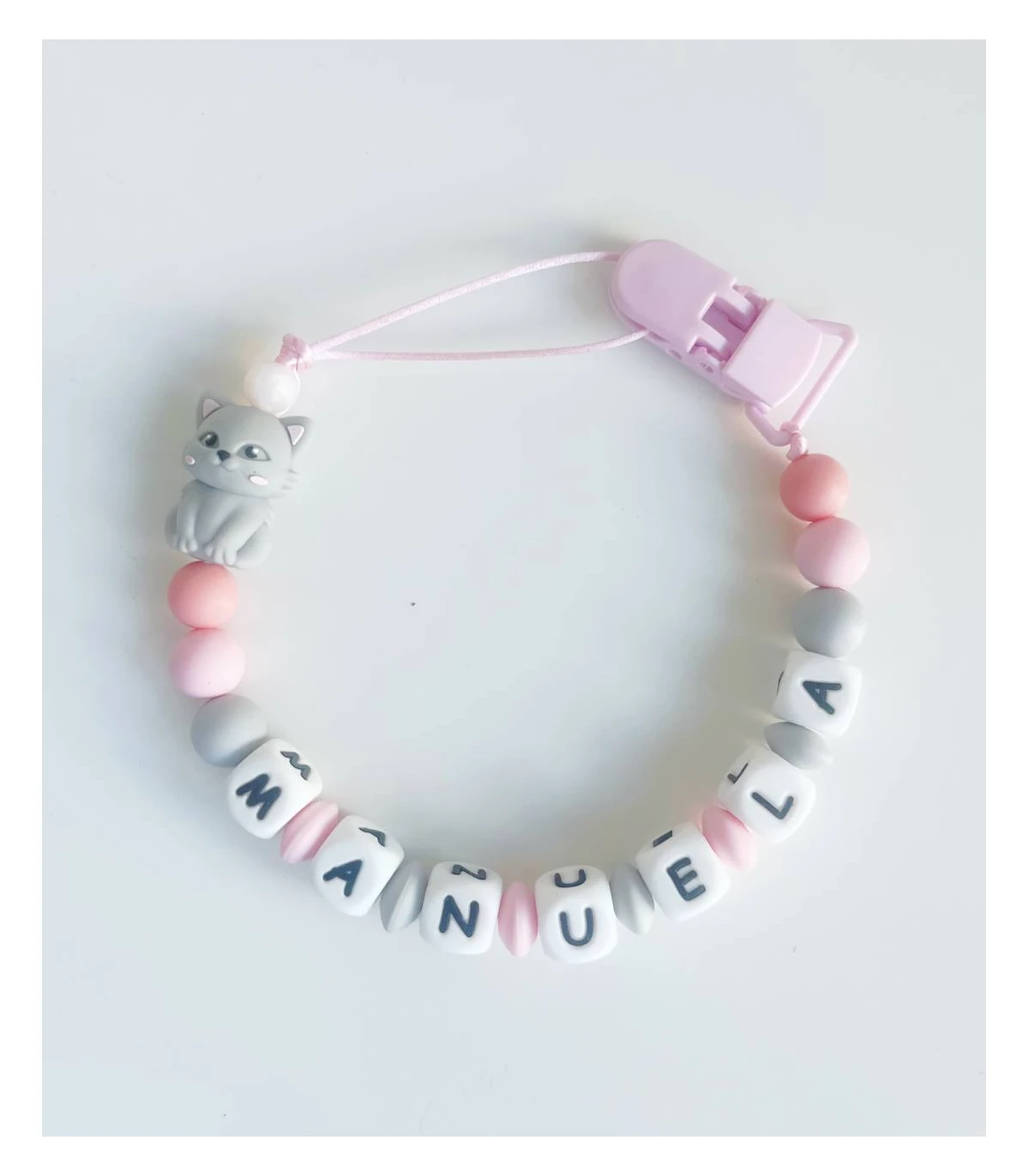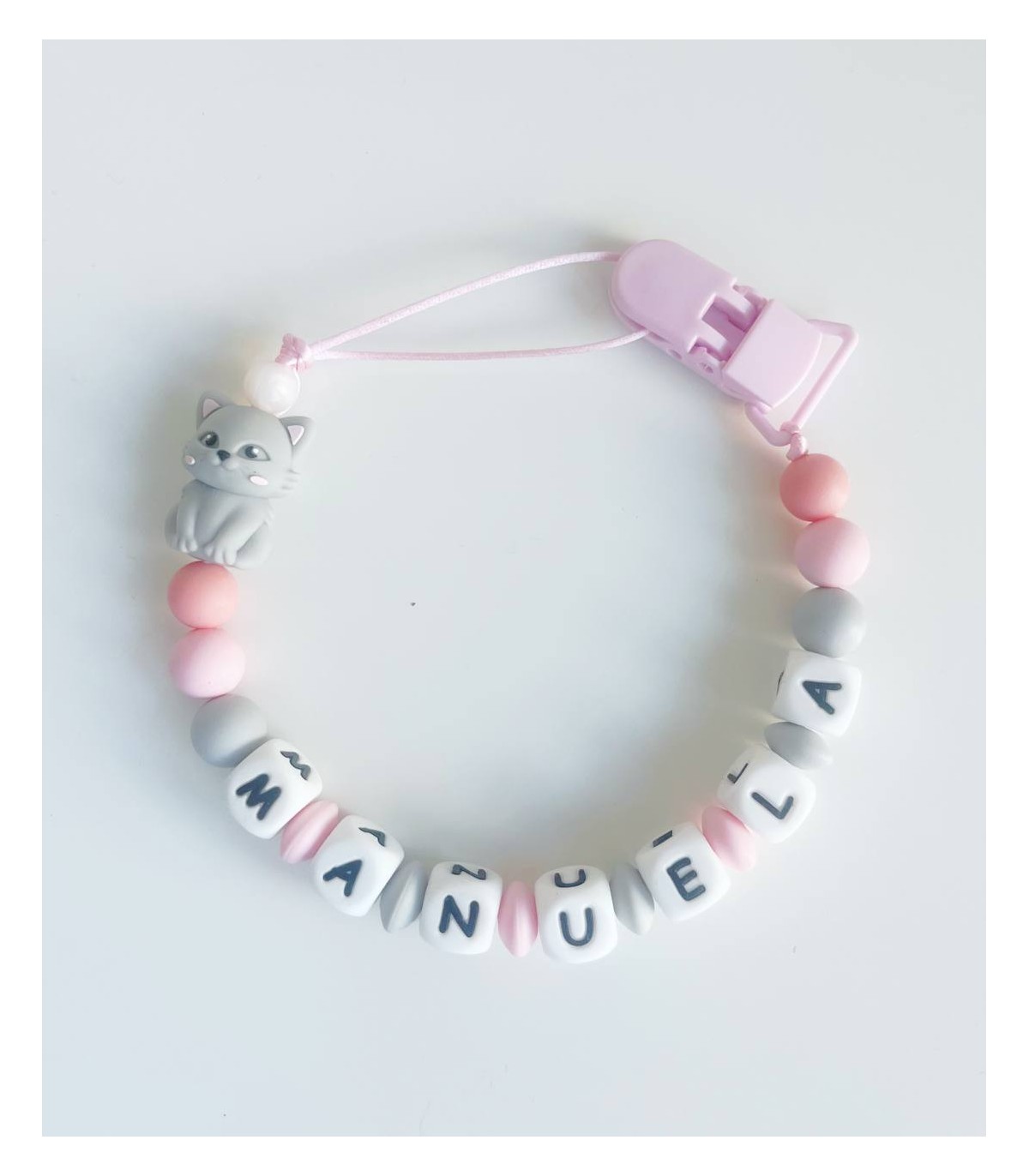 Chupetero personalizado rosa de plástico con gatito gris y bolitas de de silicona a juego combinadas de colores . El orden de las bolas puede variar en función del tamaño del nombre. No se pueden modificar bolas. Tiempo estimado de entrega de 5 a 7 días laborables.