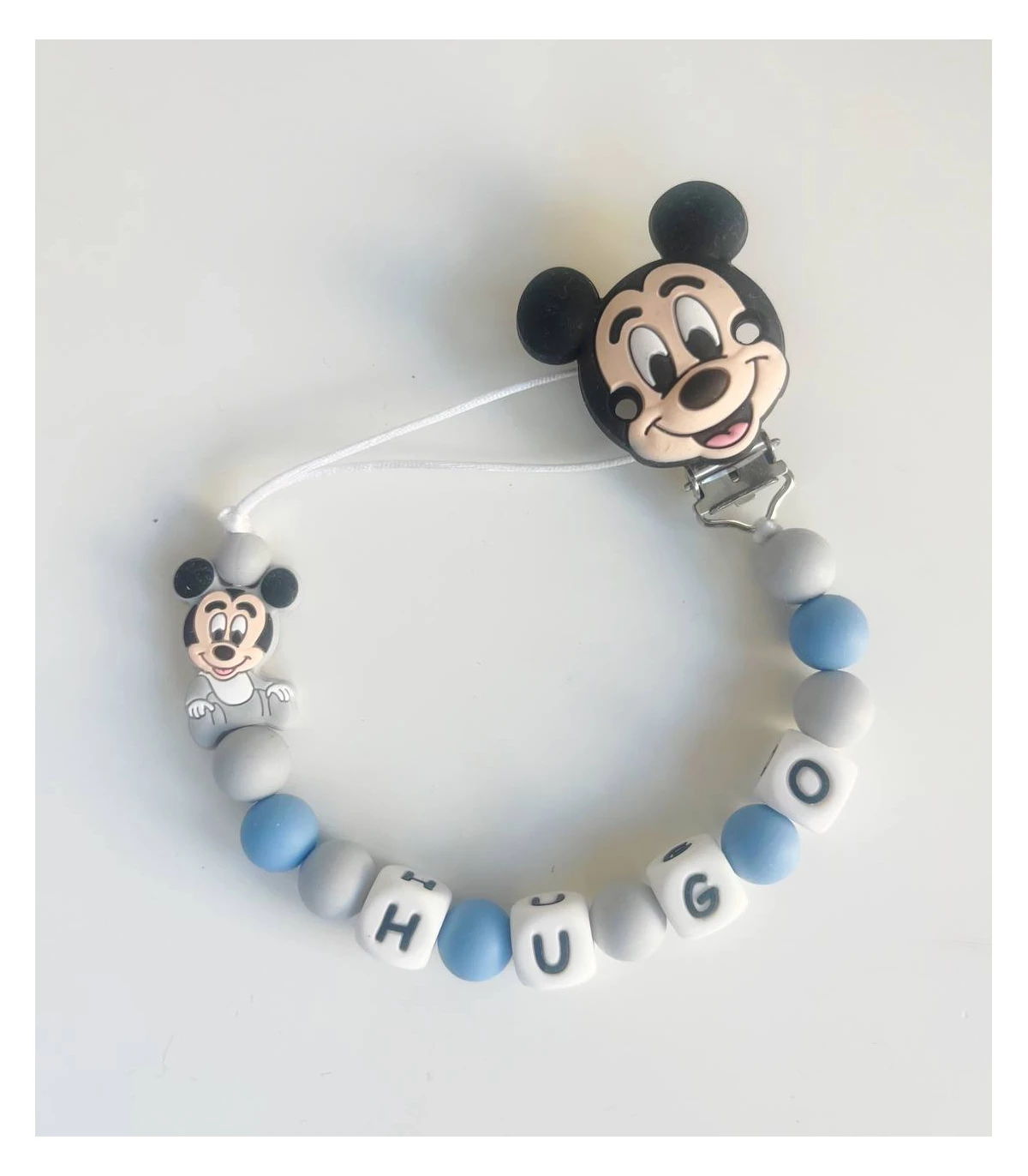 Chupetero personalizado cara Mickey azul con gris y bolitas de de silicona a juego combinadas de colores . El orden de las bolas puede variar en función del tamaño del nombre. No se pueden modificar bolas. Tiempo estimado de entrega de 5 a 7 días laborables.