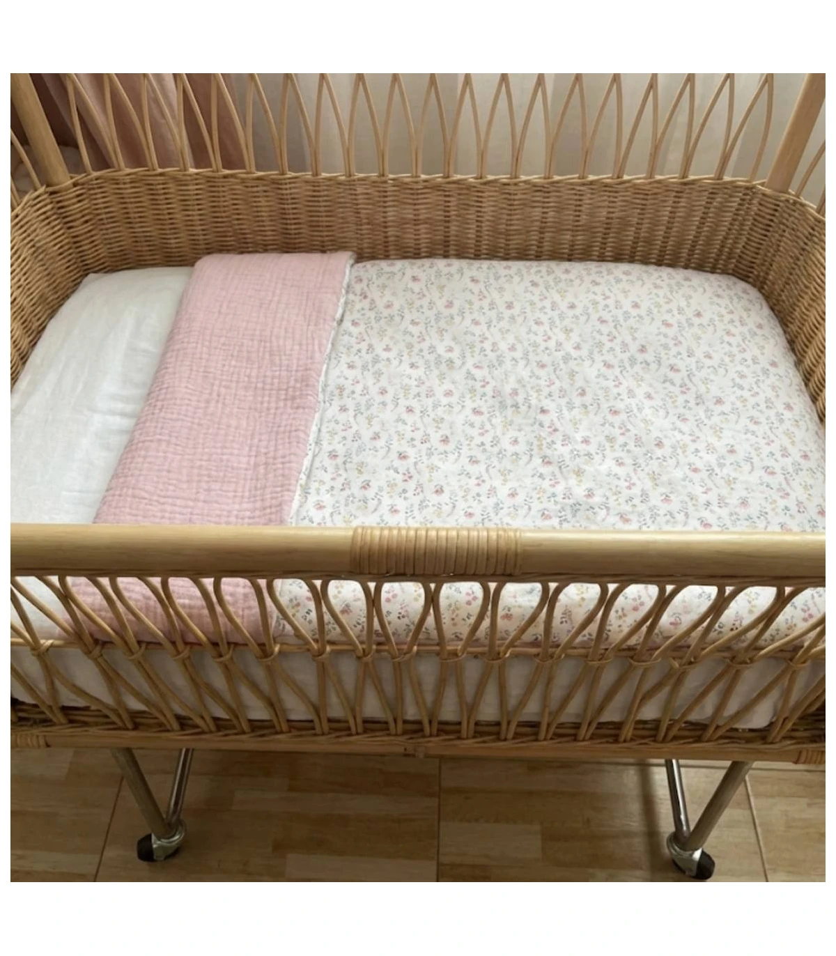 Esta combinacion representada en la imagen es por un lado de tejido liberti con flores de colores combinado verde agua, rosa, camel y blanco. Por el reverso es de muselina o bambula rosa maquillaje a juego.