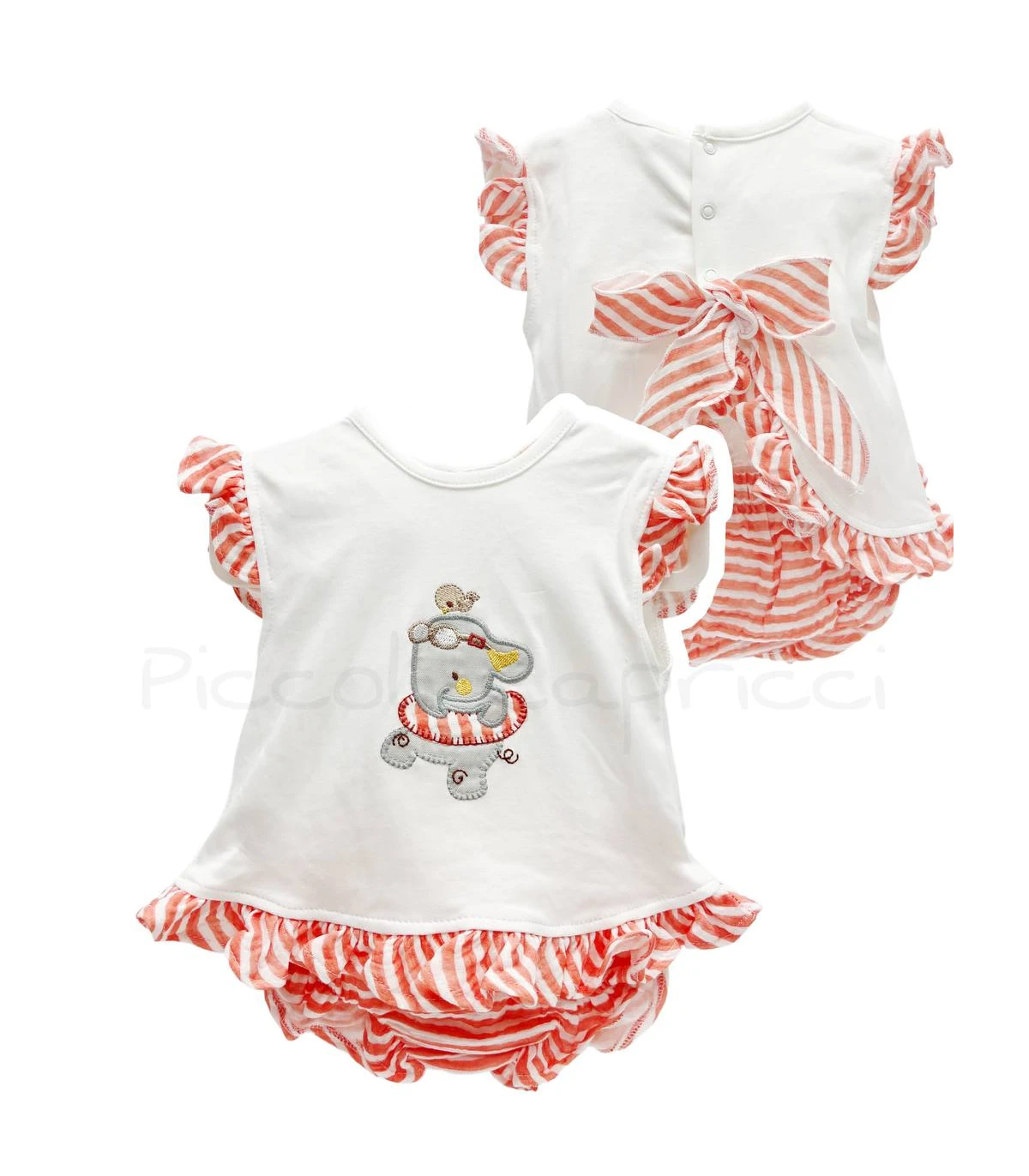 Conjunto camiseta de algodón abrochada en la espalda con apertura preciosa. Acompañado de cubre pañal de tejido muselina o bambula con estampado de rallas a juego color coral.