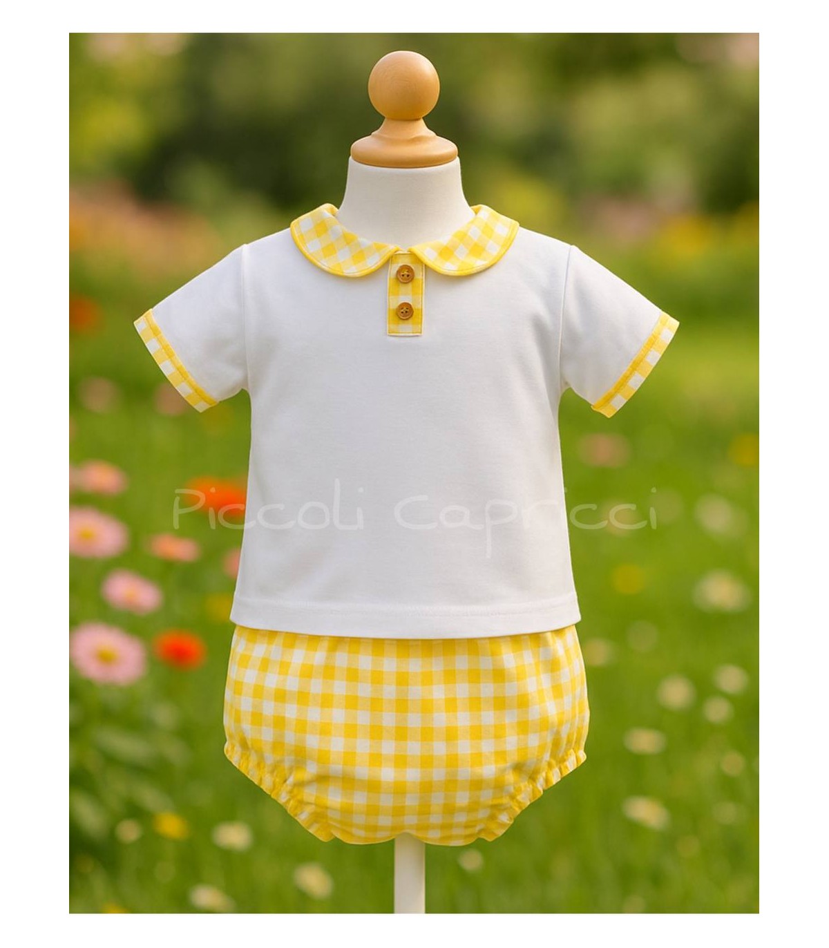 Conjunto camiseta de algodón con espalda abrochada acompañado de cubre pañal de tela con estampado de vichi a juego.