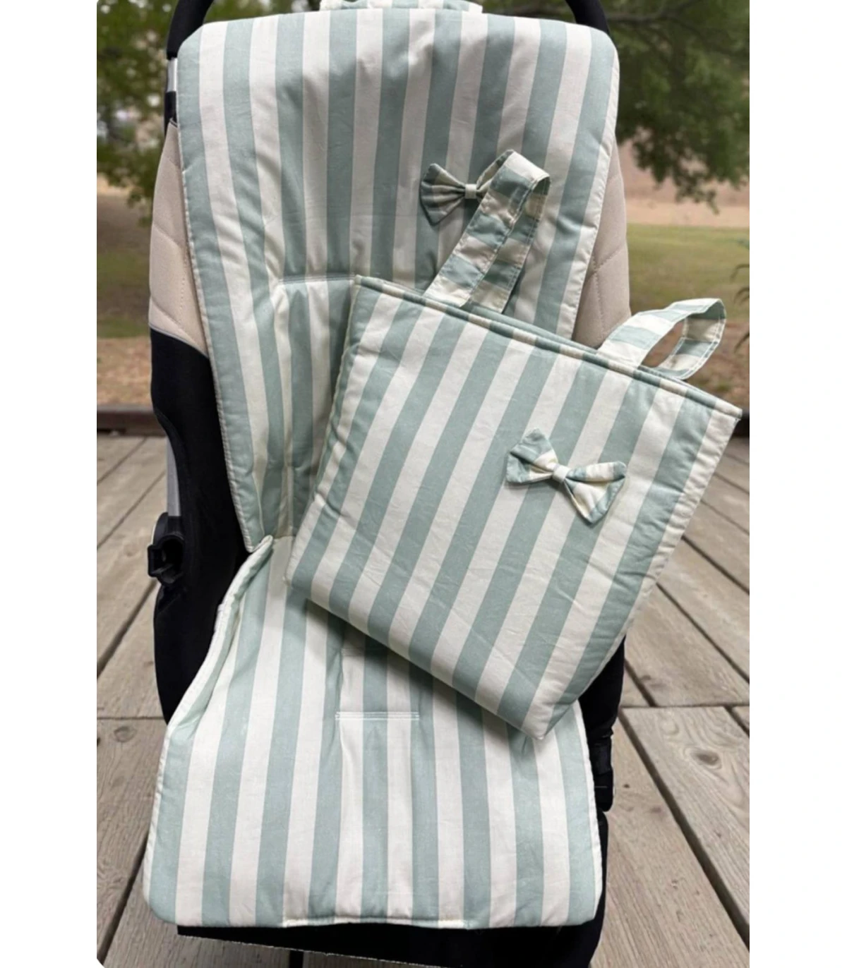 Funda de silla universal con ojales para correas dotado de cuerdas de tela arriba para poder atarla a cualquier tipo de carrito. También incluye bolso talega de tela del mismo tejido con cremallera y forrado por dentro.