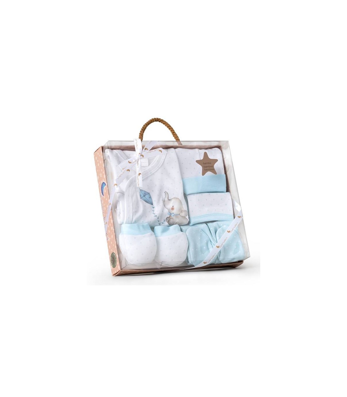 Estuche regalo de recién nacido de 5 piezas con estampado de elefante celeste