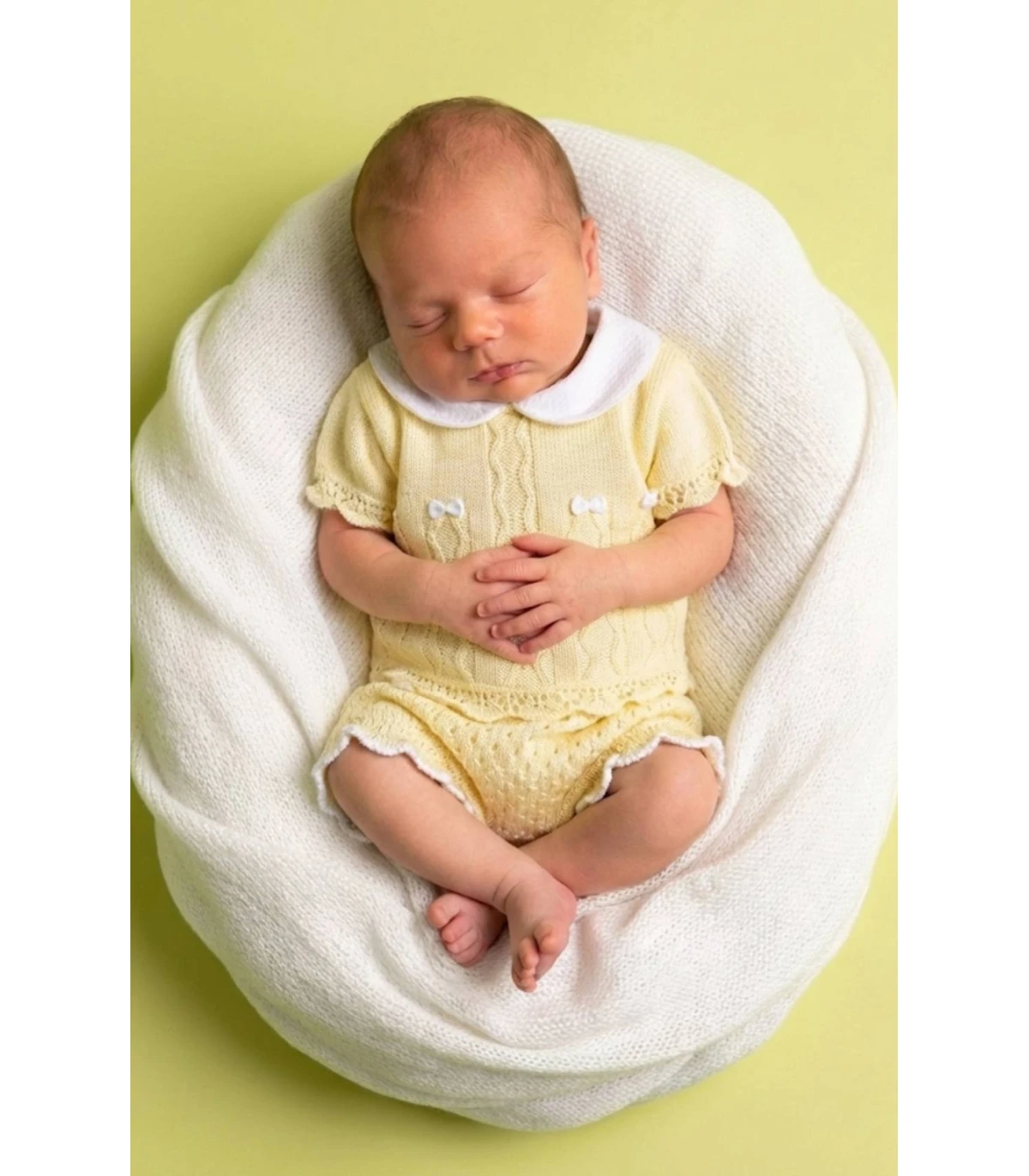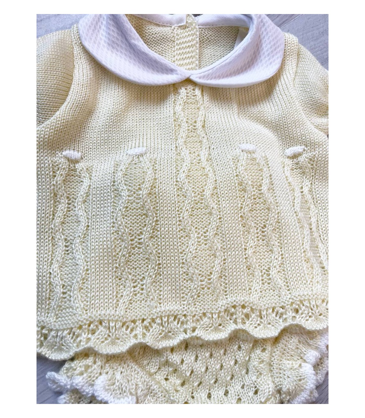 Conjunto de hilo dos piezas. Incluye baguita cubre pañal y, jersey. Es talla única para bebé aproximadamente de 0-1 mes. Ideal para primavera verano.
