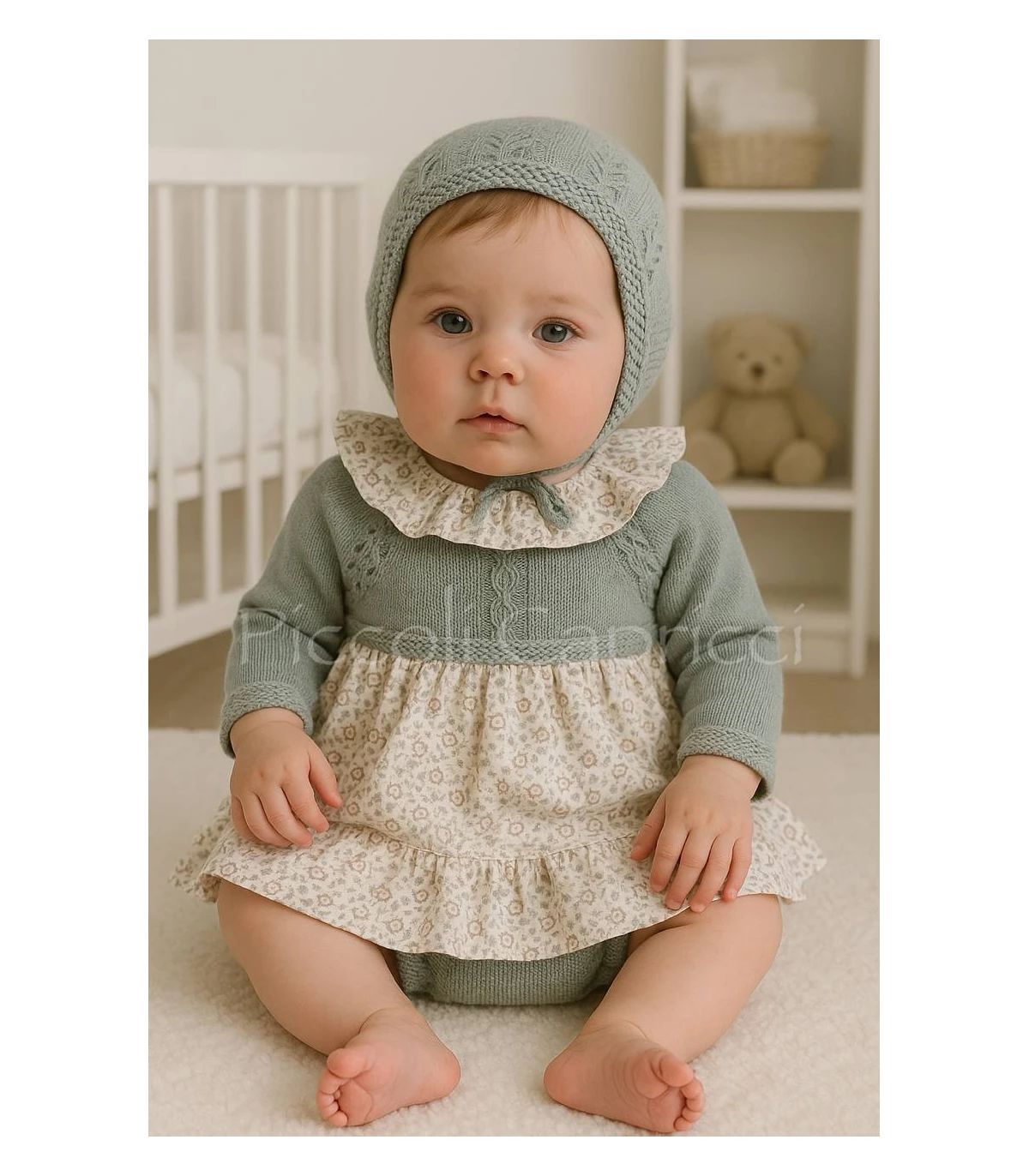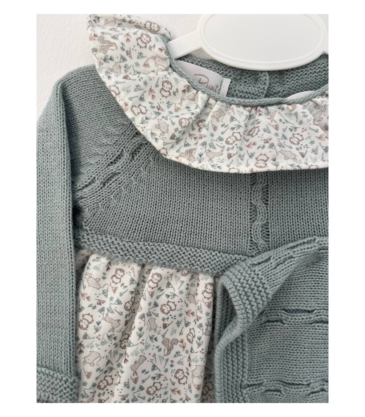 Jesusito con parte superior de punto lana y parte inferior de muselina estampada con animalitos de una granja en tonos verde, camel y celeste.