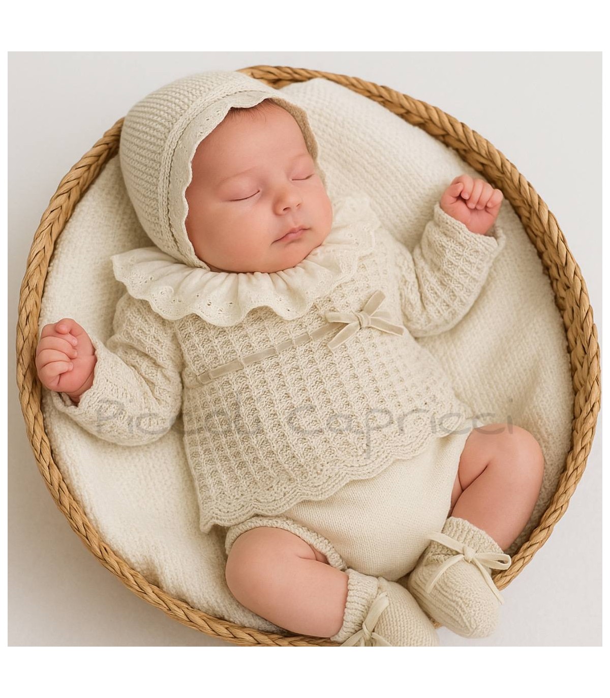 Compuesto por jersey, cubre pañal, patucos y gorro.