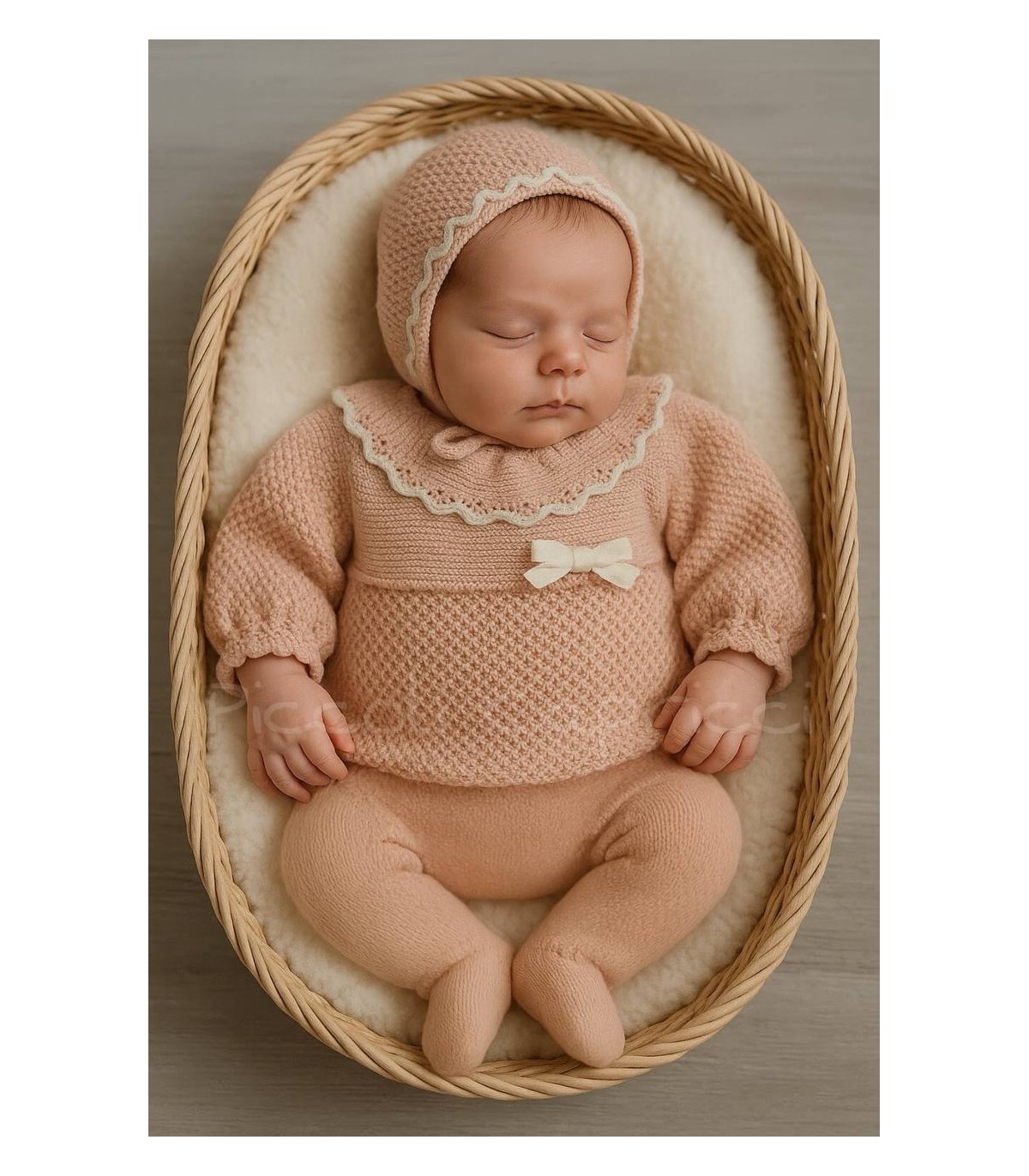 Conjunto canesú de gorro, jersey y polaina modelo sueño, color rosa empolvado.