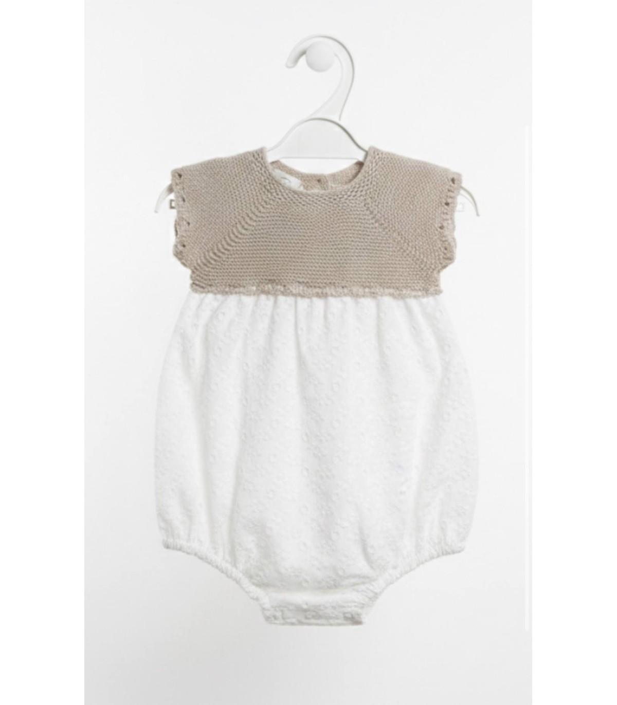 Pelele de hilo con tela en la parte de abajo y botones en la parte de espalda disponible desde 1 mes hasta 24 meses.