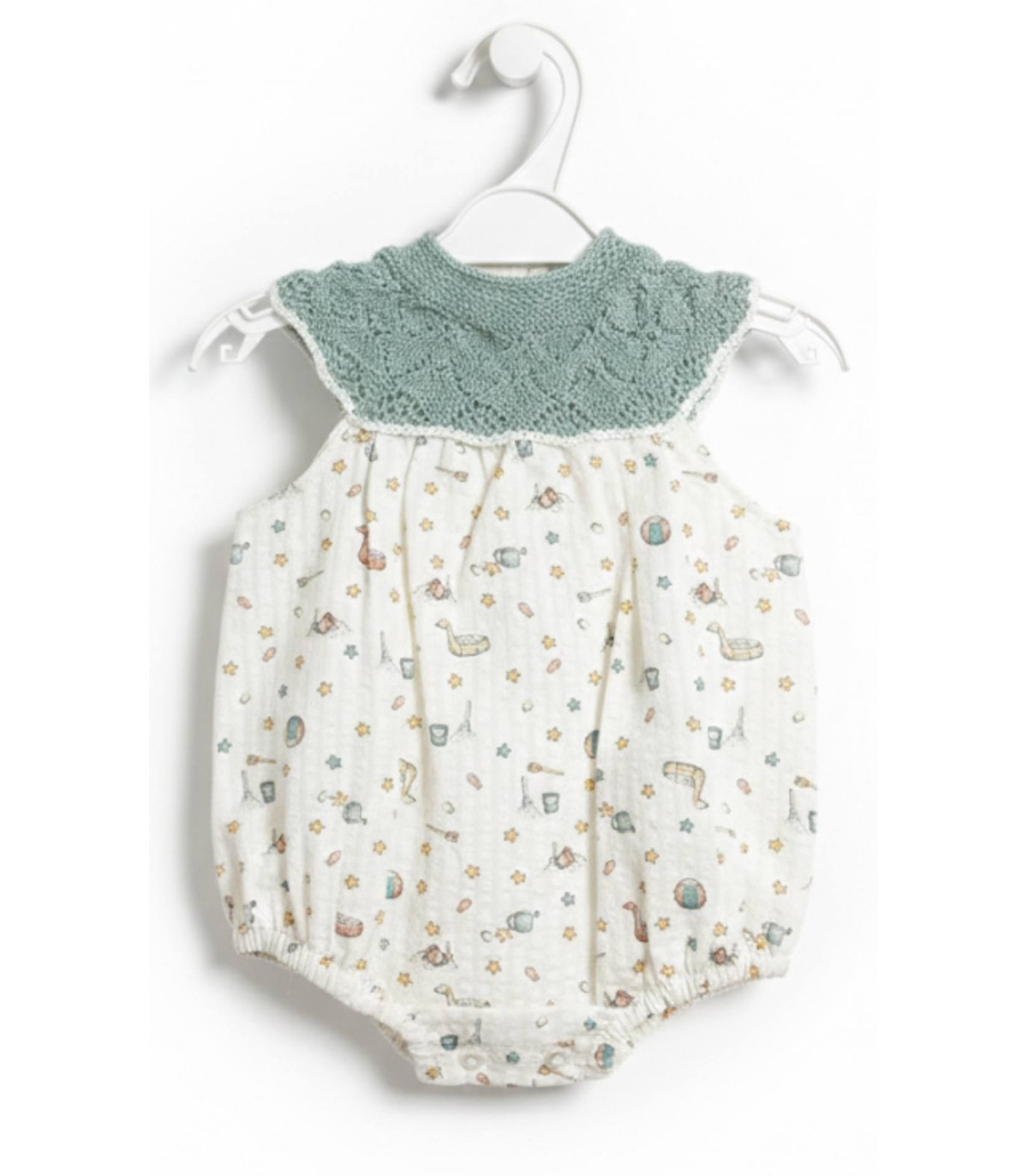 Pelele de hilo con tela en la parte de abajo y botones en la parte de espalda disponible desde 1 mes hasta 24 meses.