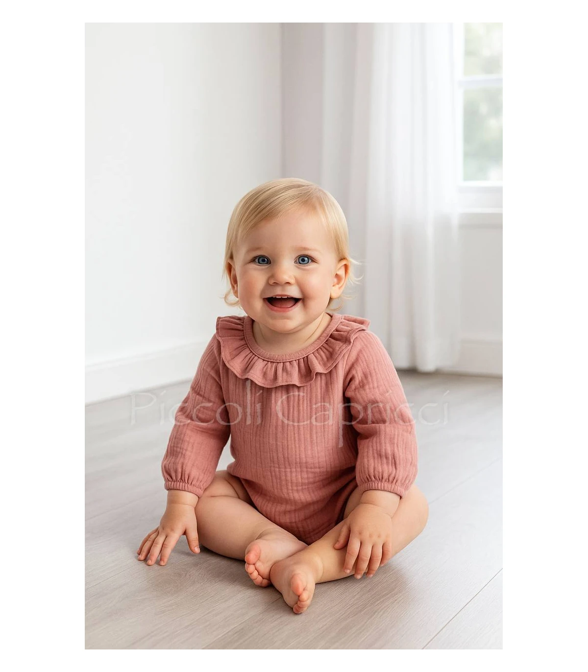 Pelele familia Estena color rosa nude de tejido muselina o bambula con botones pequeños en la parte de abajo y por la espalda. Está disponible desde 1 mes hasta 24 meses. Ideal para entre tiempo y combinarlo con calcetines o rebecas.