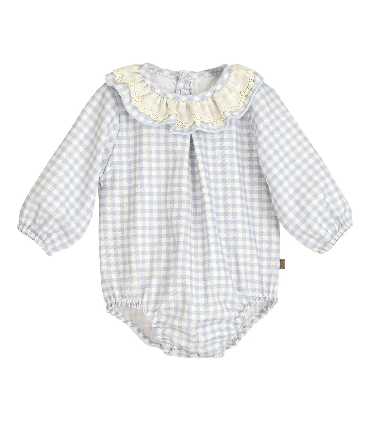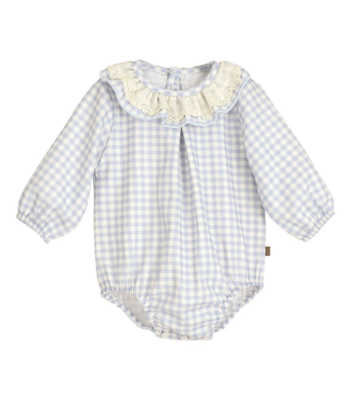 Pelele de bebé unisex para niño y niña de cuadritos vichi color celeste y doble cuello volante con puntilla de tira bordada en el filo.