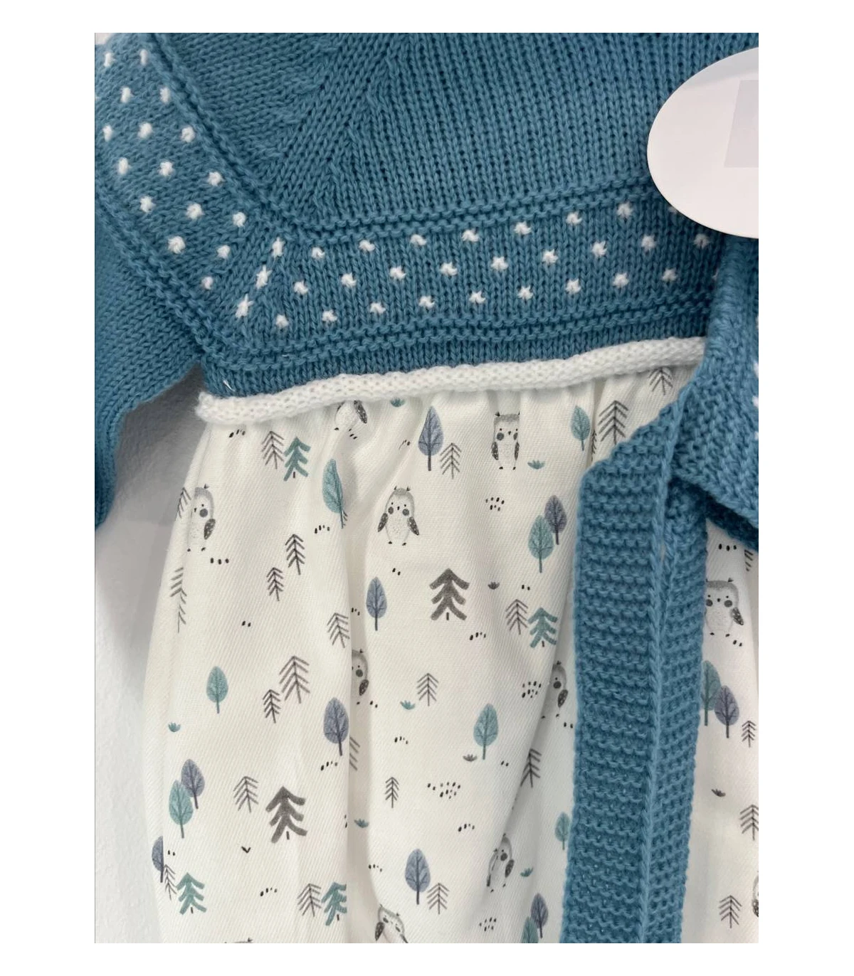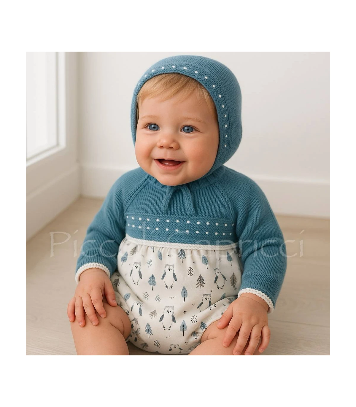 Pelele de parte superior lana y parte inferior tela estampada modelo buho turquesa.