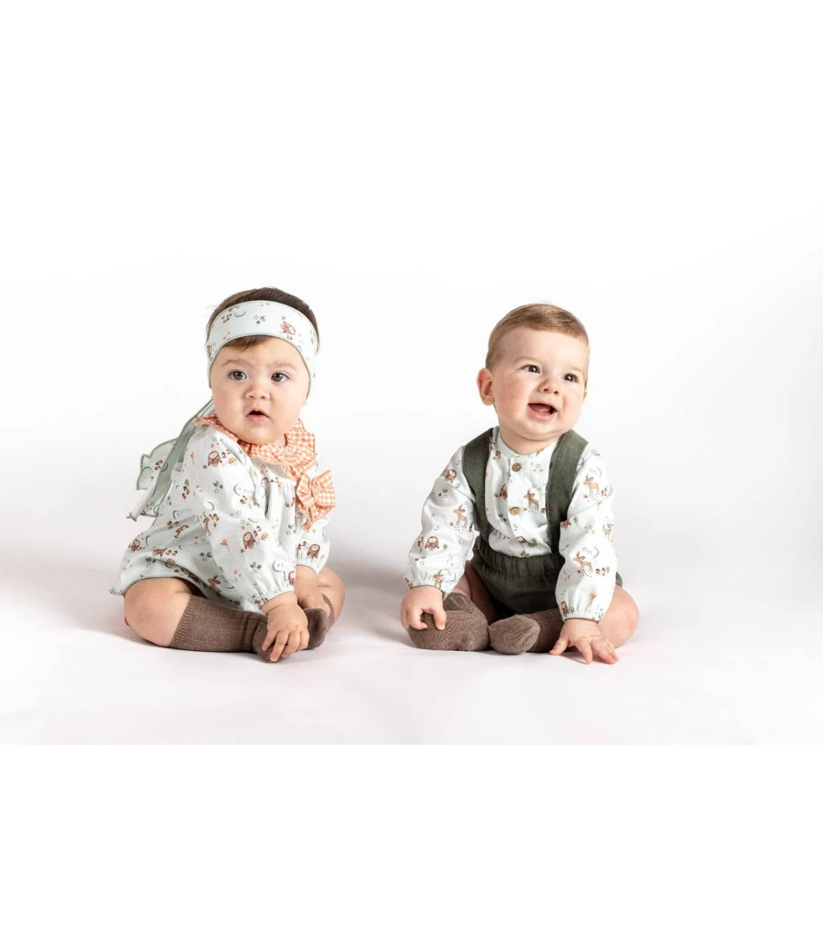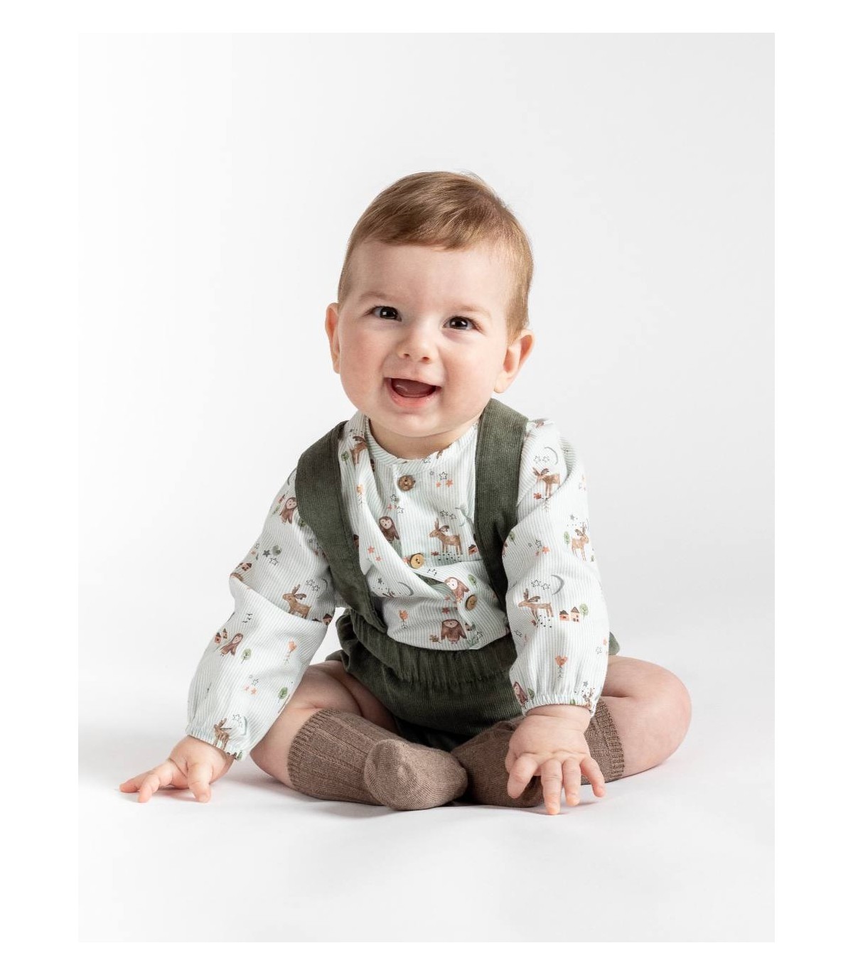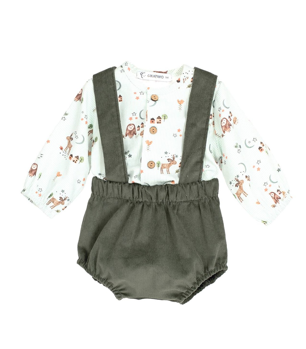 Conjunto compuesto por camisa estampada de animalitos con fondo rallas verde agua y blanco abrochada con botones de madera, conjuntado con peto cubre pañal tejido micro pana color verde prado de tirantes abrochado con botones de madera.
