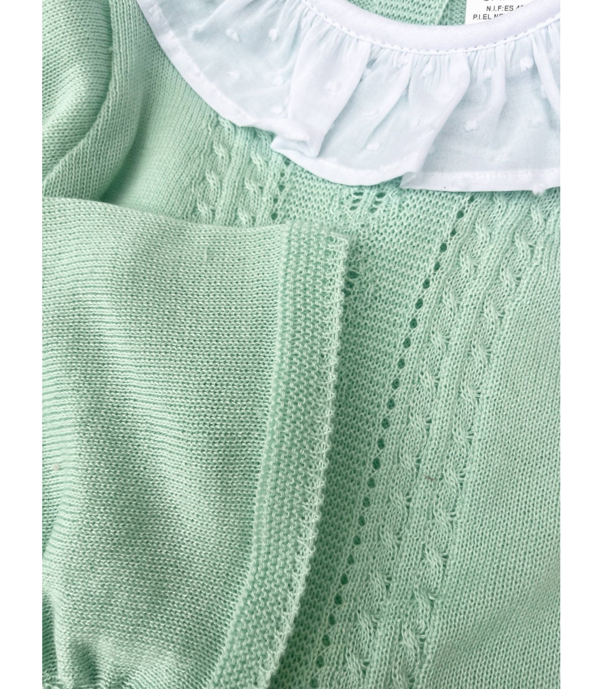 Conjunto de hilo tres piezas. Incluye polainas, jersey y capota. Es talla única para bebé aproximadamente de 0-1 mes. Ideal para primavera verano.