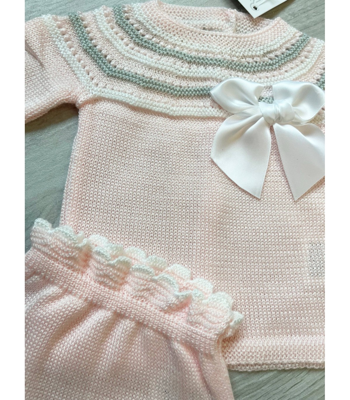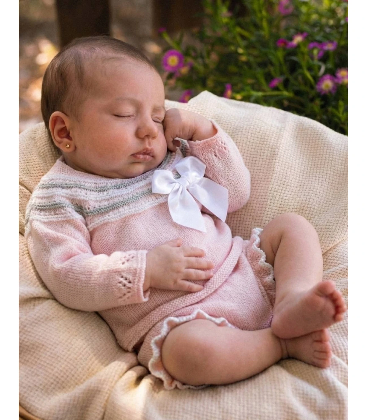 Conjunto de hilo dos piezas. Incluye baguita cubre pañal y, jersey. Es talla única para bebé aproximadamente de 0-1 mes. Ideal para primavera verano.