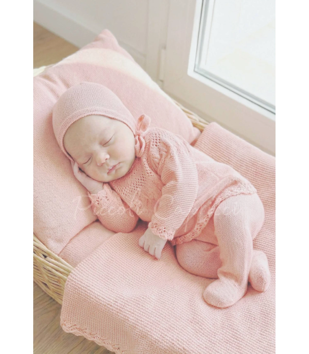 Conjunto compuesto por jersey, gorrito estilo capota y polaina de bebé.