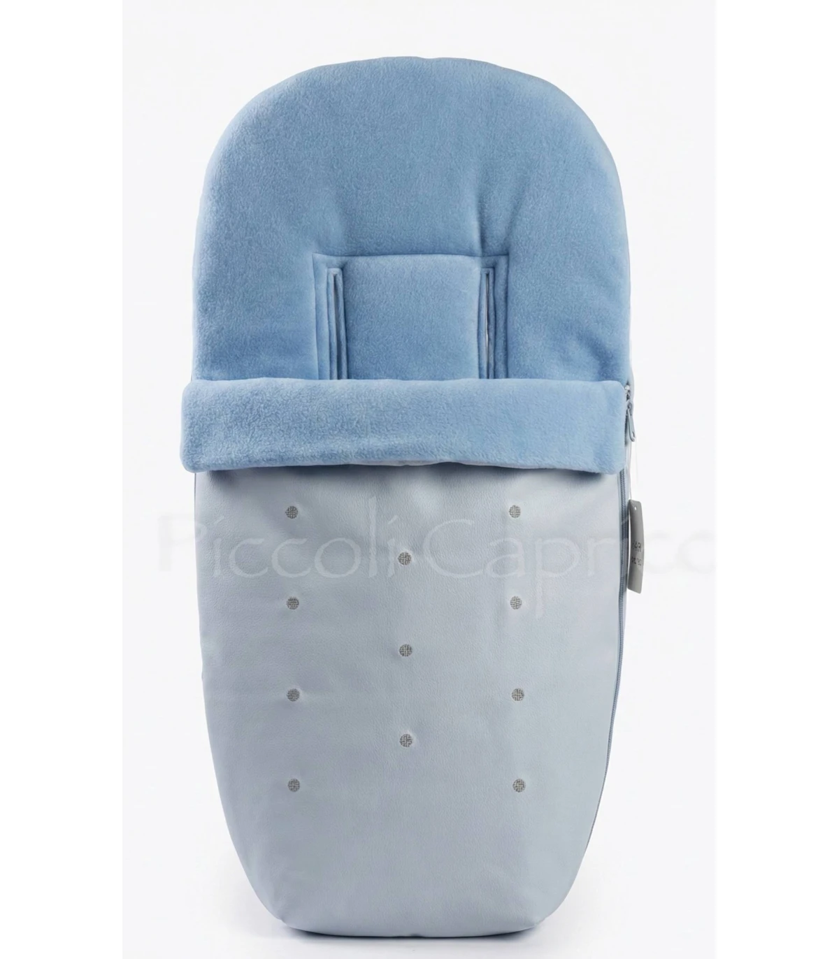 Saco de silla universal para todo tipo de carritos con tejido polar celeste. Combinado con cubrepiés de polipiel celeste y bordados de color gris. Una combinación perfecta y muy combinable para cualquier color de carrito. Tejidos suaves y muy calentitos. El saco está dotado de varias aberturas para sacar las cinchas de sujeción del niño. Tiene una cremallera a todo alrededor del cubrepiés para poderlo quitar.