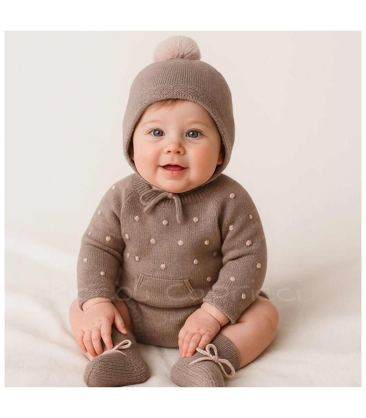 Conjunto de lana para bebé de cuatro piezas. Incluye gorro, jersey, patucos y braguita disponible desde 1 mes hasta 12 meses.