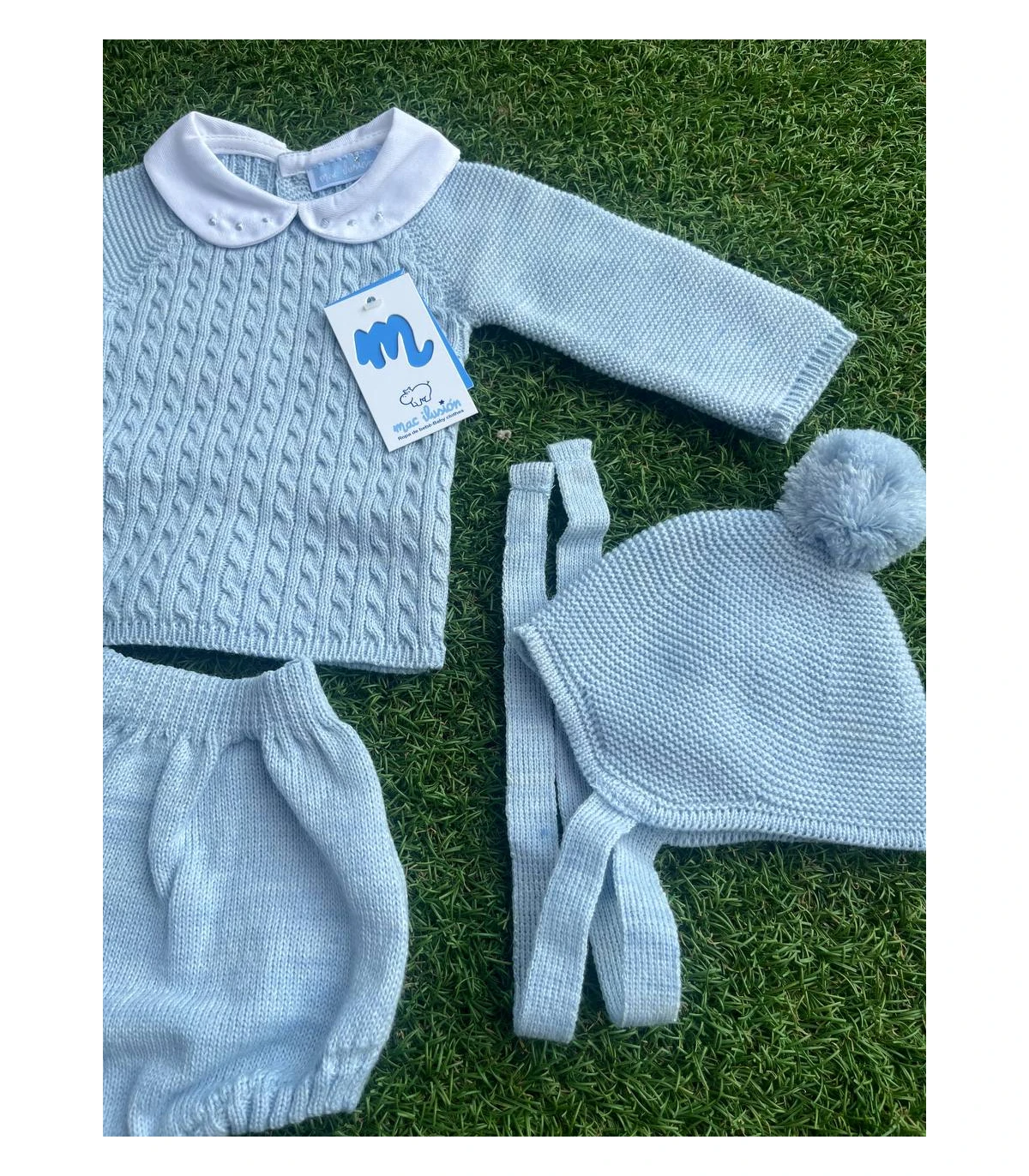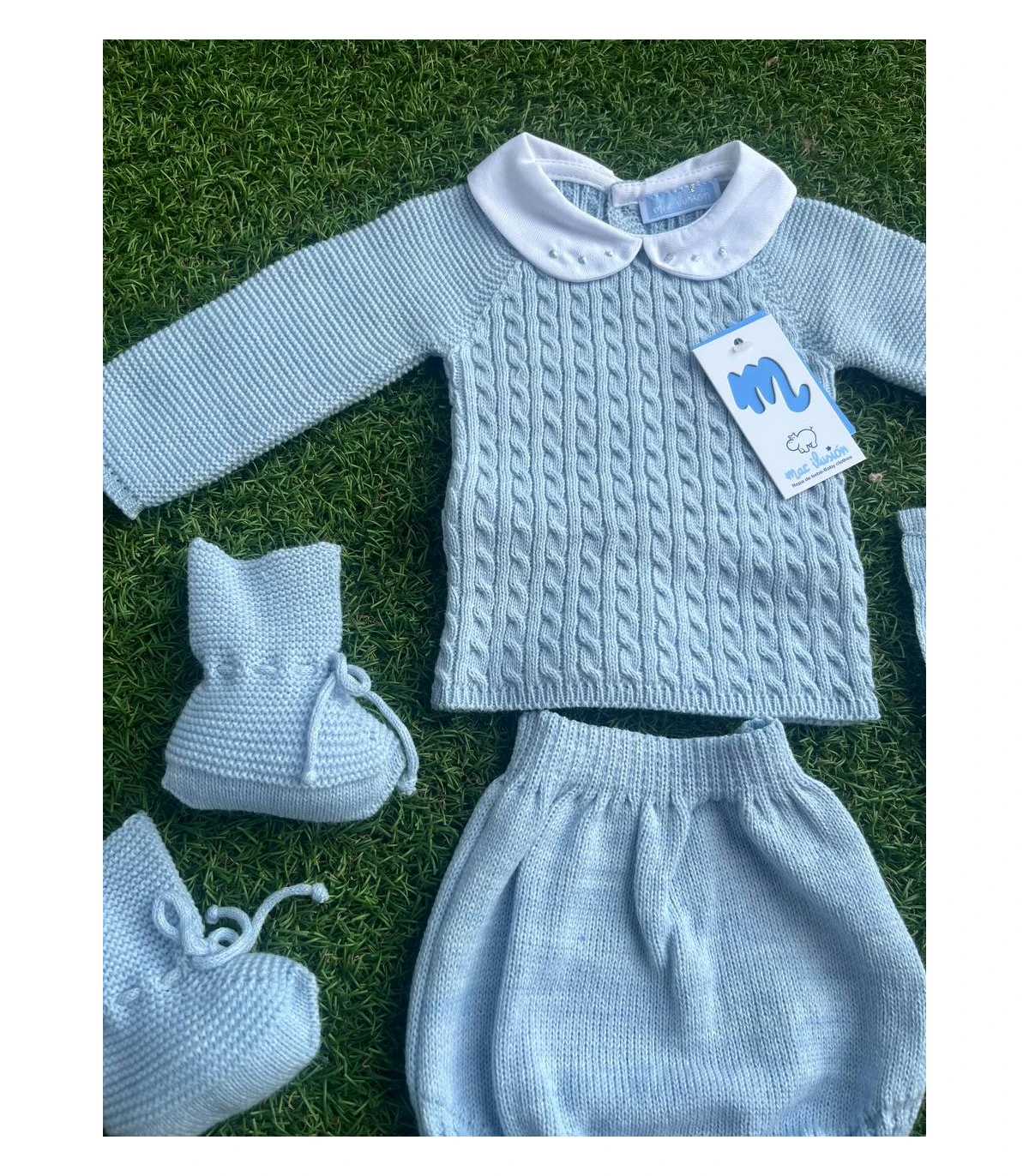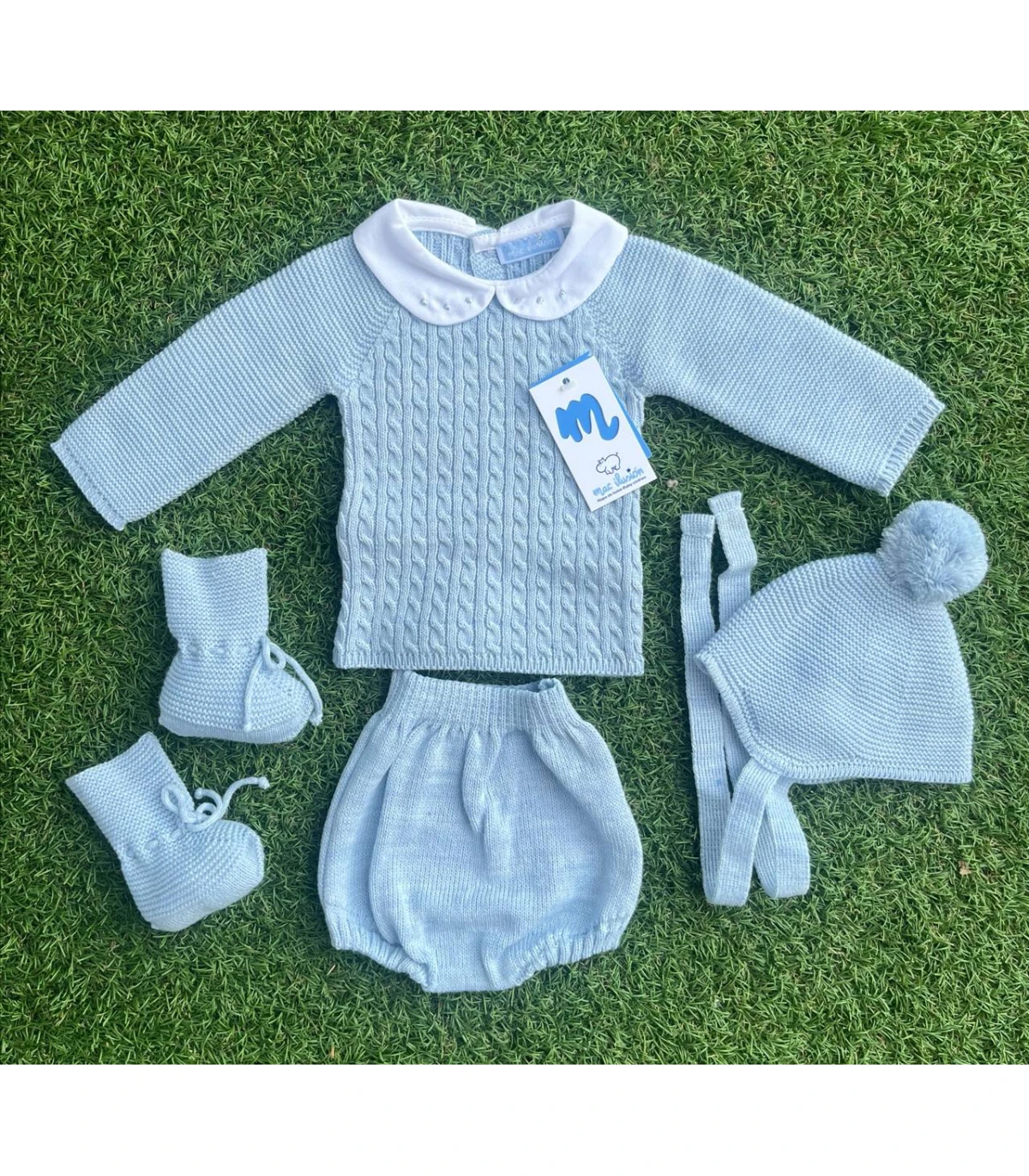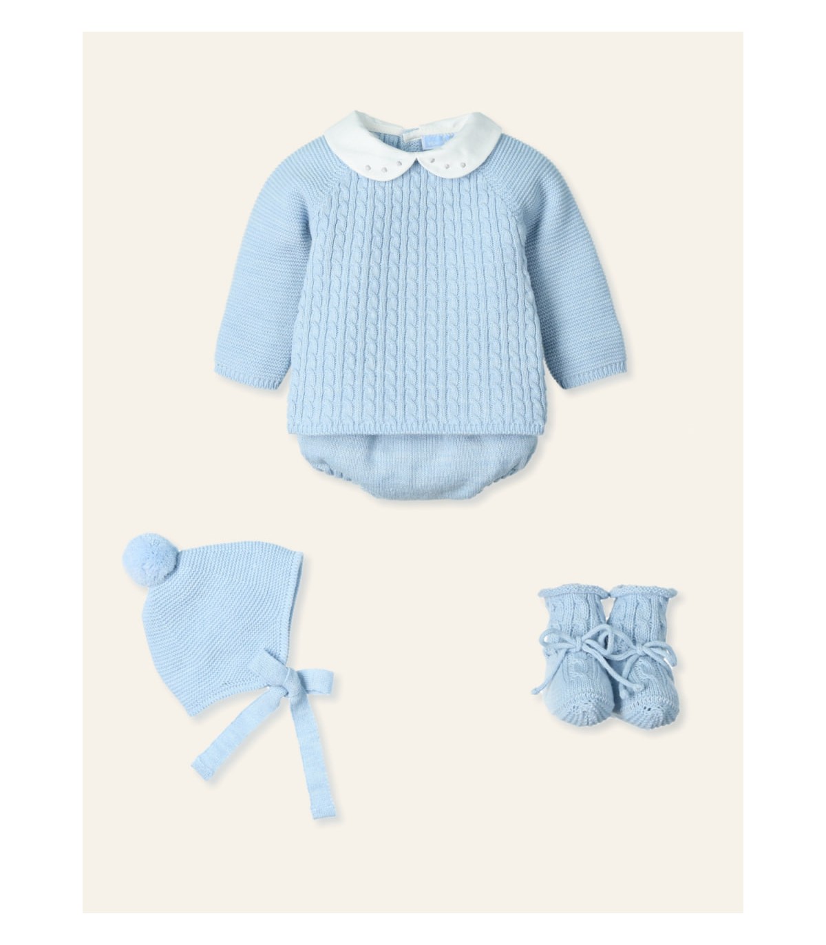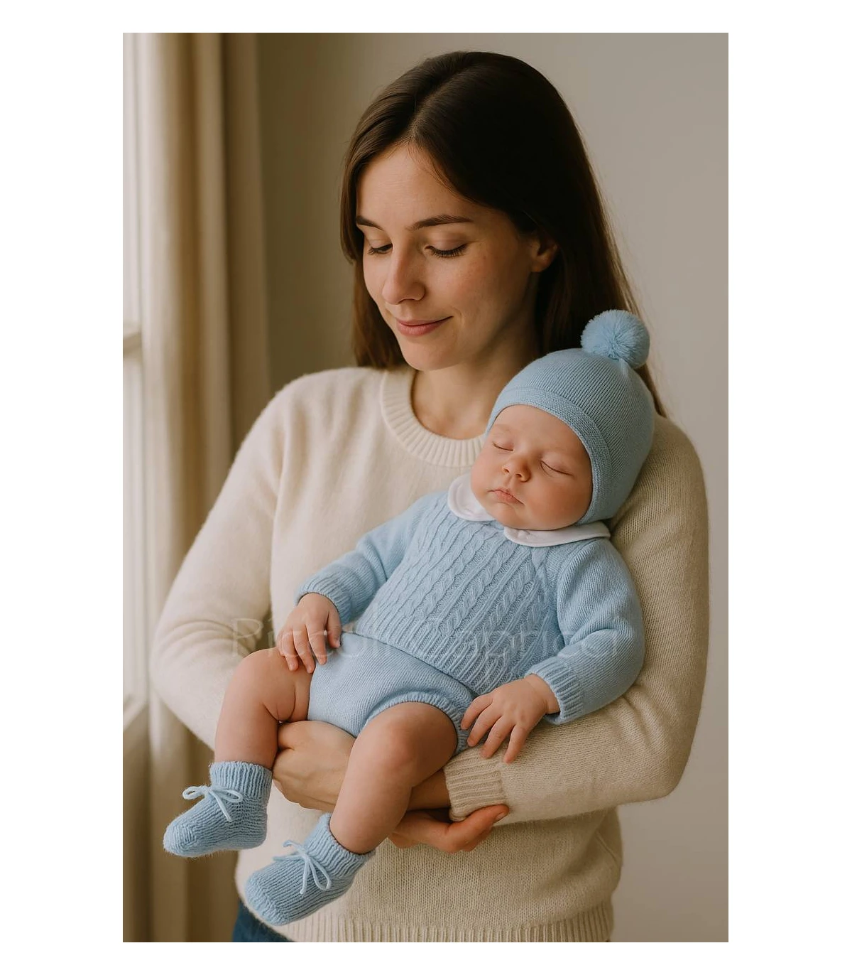 Traje 4P trencitas con cuello bordado, patucos y gorro pompom "CLOUD BRAIDE"