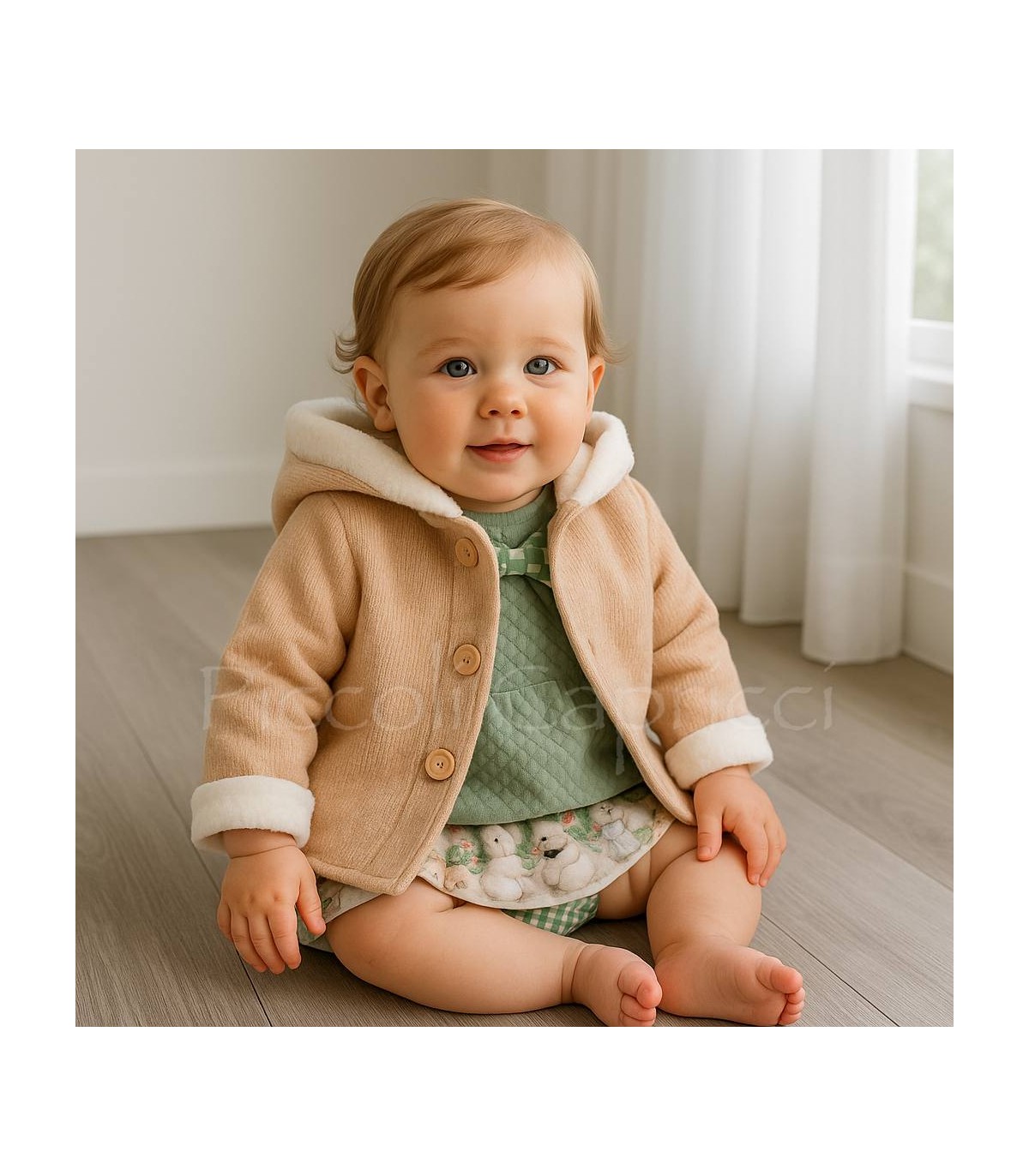 Abrigo o trenca de lana para bebé forrada de borreguito muy suave y calentito.